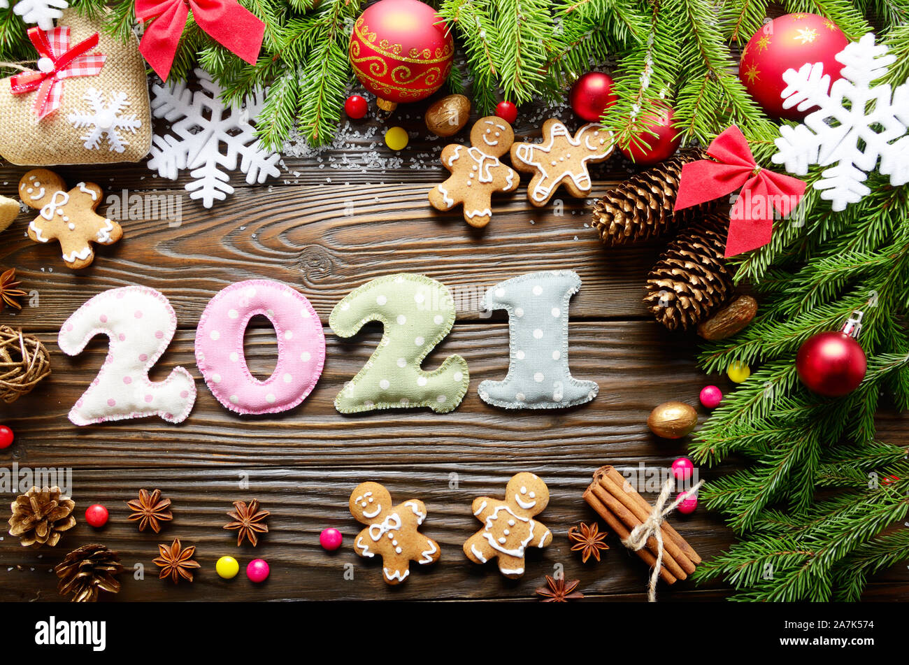 Colorata Cucito Cifre 2021 Di Polkadot Tessuto Con Decorazioni Di Natale Lay Piatto Su Sfondo Di Legno Foto Stock Alamy